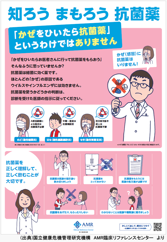 ウイルスによって起こる風邪やインフルエンザには、抗菌薬は効果がありません。抗菌薬を正しく飲むこと、感染症を予防することが、薬剤耐性対策として重要です。